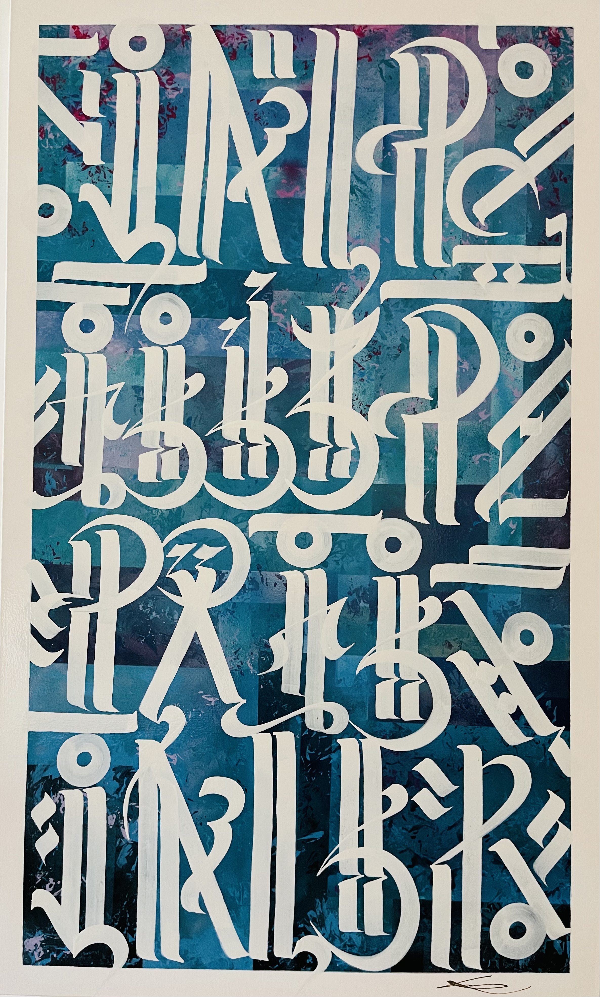 Clark Medley presents calligraphic-thought-thinking paintings. He creates a visual arabesque-like alphabet that conjures Chinese, Arabic, Japanese, Judaic, Hindi calligraphies. The inscriptions develop in dynamic turns and twists, deriving in a visual script of cursives and imaginary fonts. They transcribe the artist’s perceptual and aural experiences, such as sounds and phrases he draws from his close surroundings. The works present literary meanings of personal abstraction. Medley’s works excel in their opticality based on their high glare artifice that results from the artist’s use of gold leaf in the backgrounds, and colored glass powder and acrylic paint in delineating the lettering.