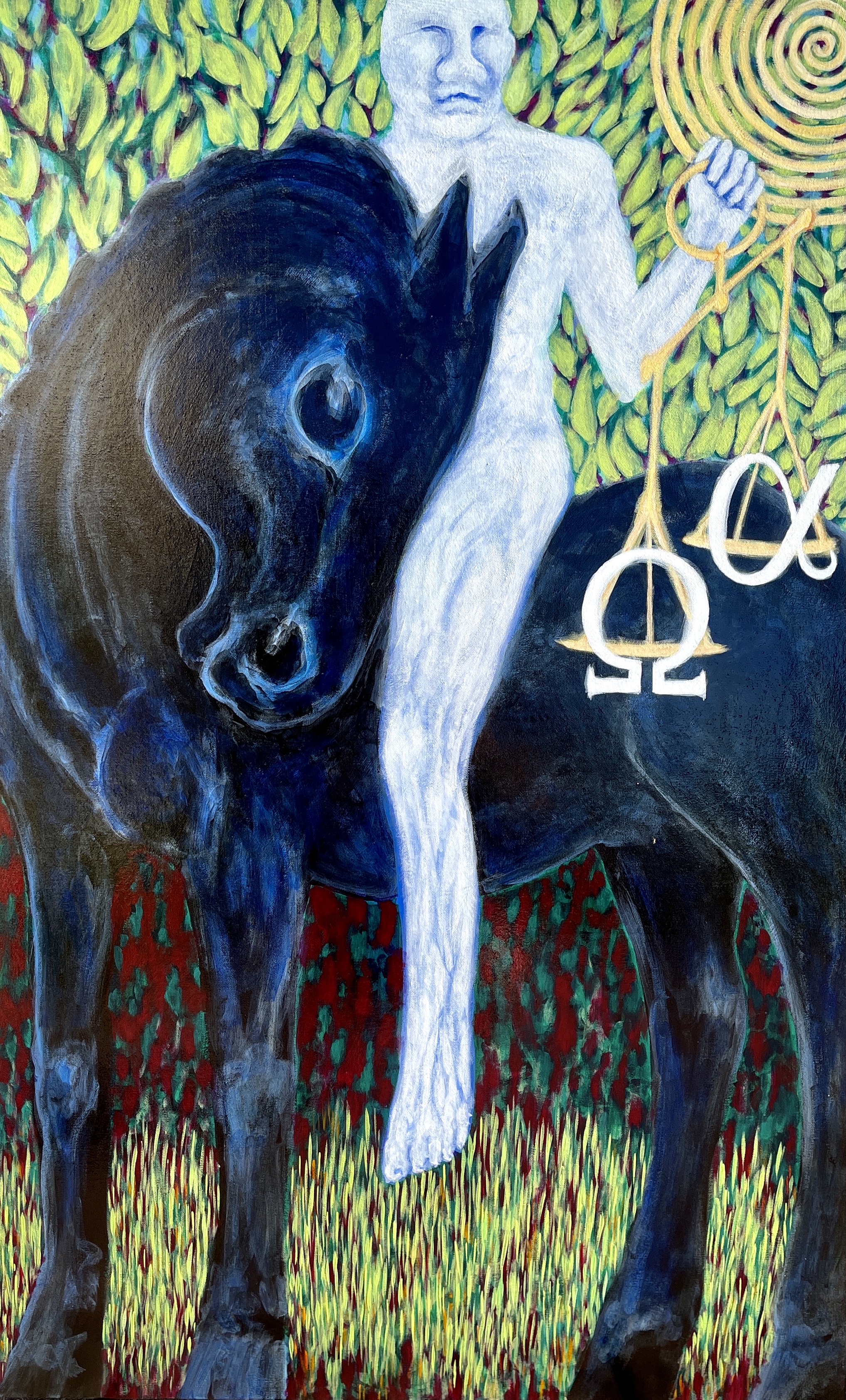 Meg Cogburn proposes in her figurative painting on canvas a strong biblical reference to Famine of the Horses of the Apocalypse. Cogburn peculiarly interprets its symbolism through a hopeful vision on humankind. Regeneration and spiritual enlightenment oozes in the scene: the Famine’s horse rider is portrayed as a stone-like personage, and his horse is rigidly crashing on the ground, but they are blissfully surrounded by buoyant green growth and upbeat symbols of renaissance in the alpha and omega emblems.